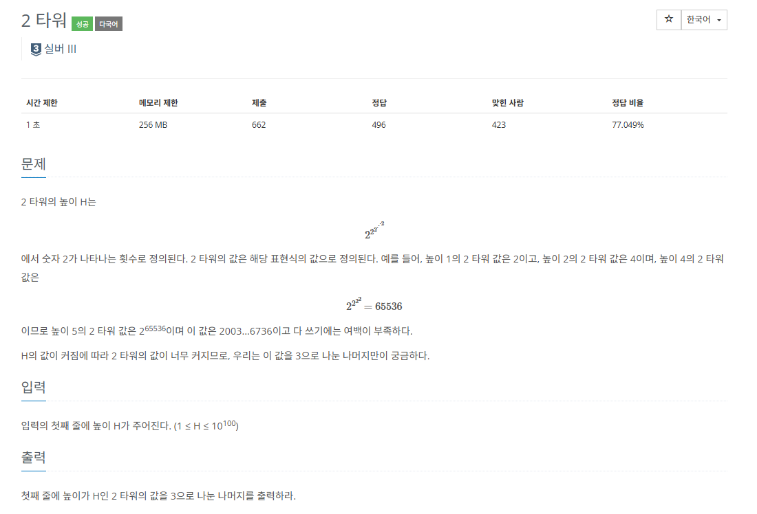 H의 값이 커짐에 따라 2 타워의 값이 너무 커지므로, 우리는 이 값을 3으로 나눈 나머지만이 궁금하다.